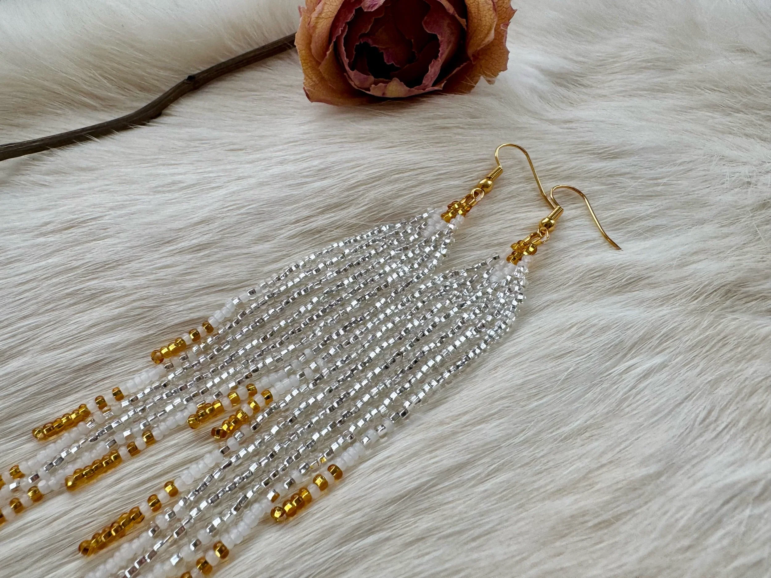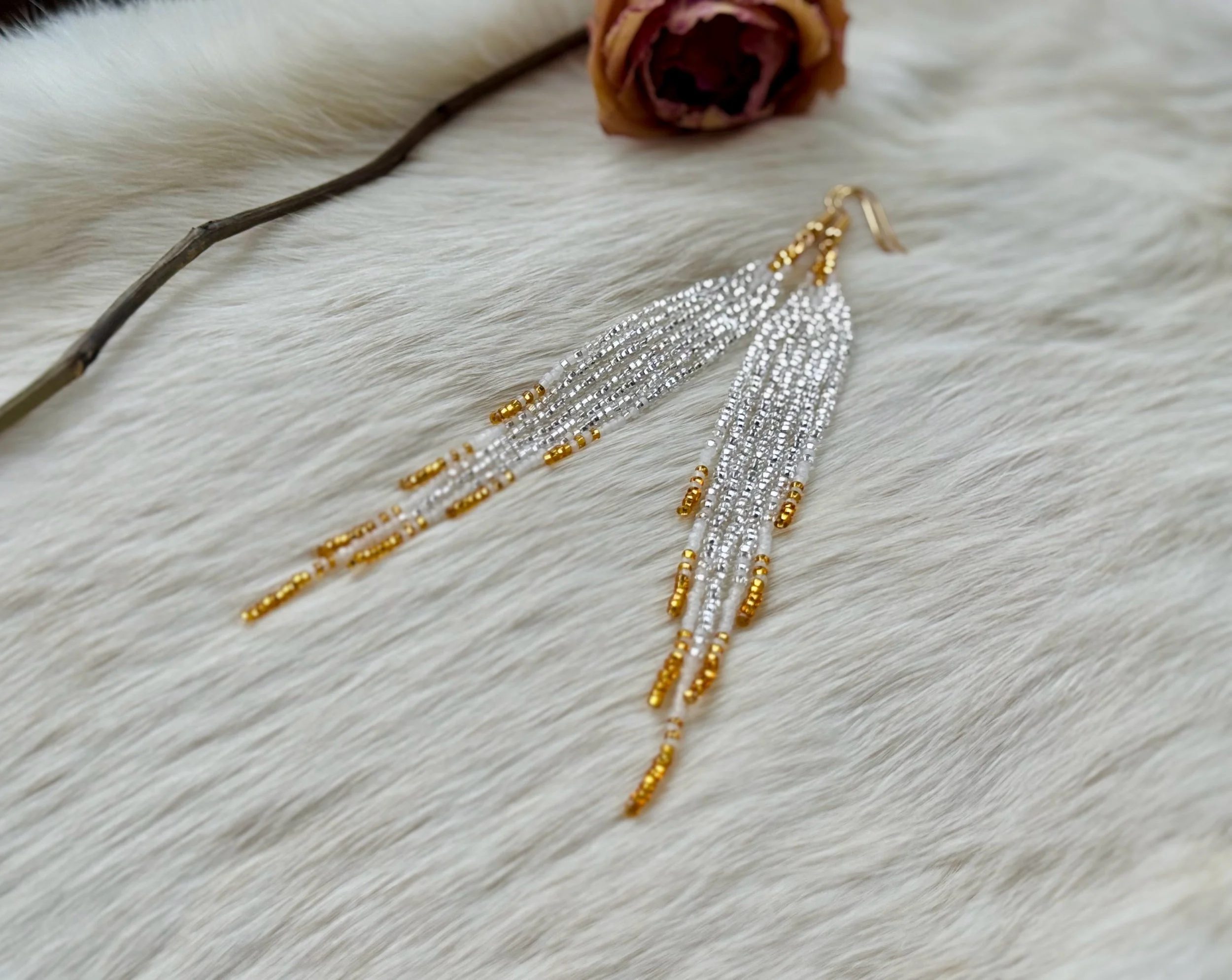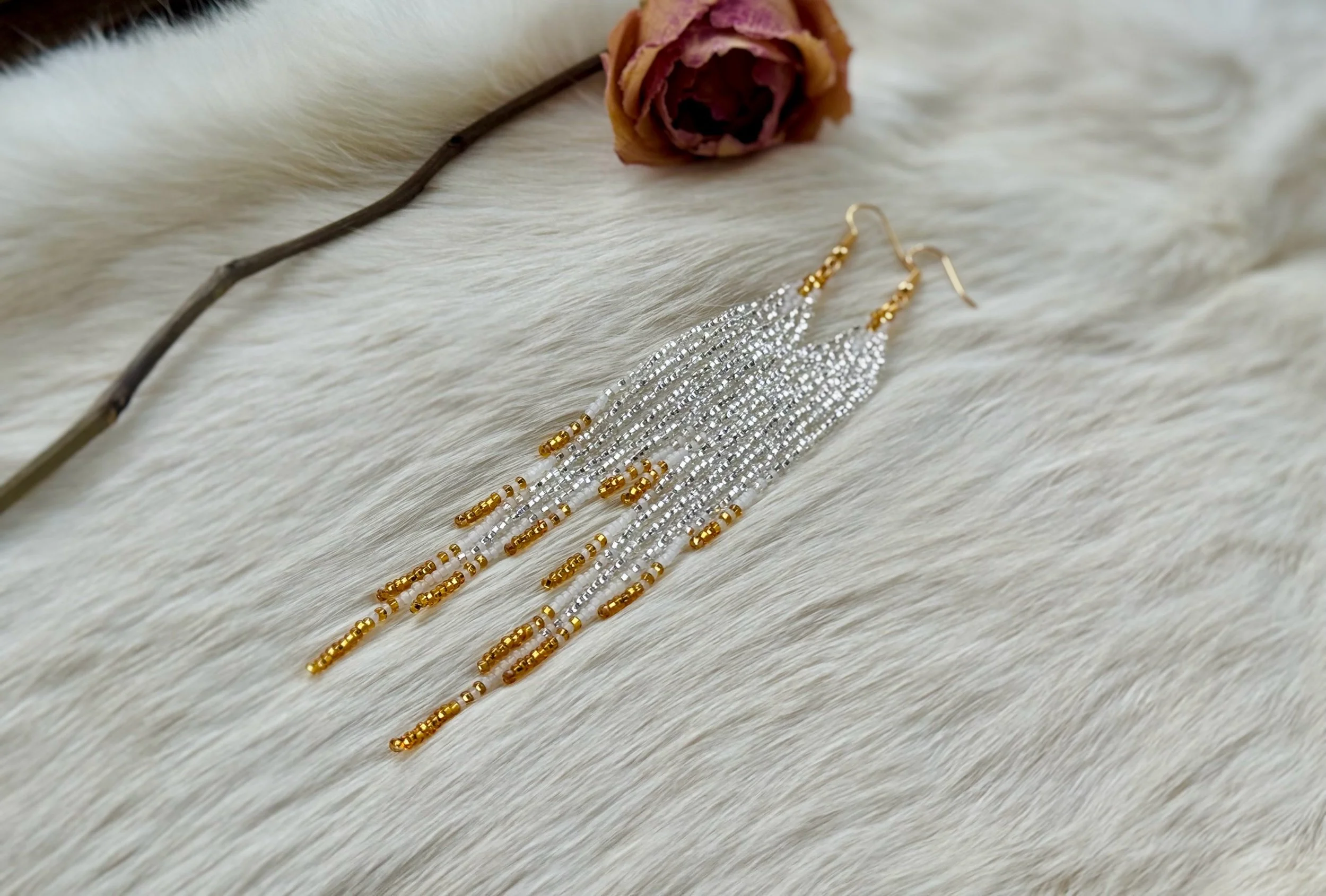 Made with glass seed beads and hypoallergenic gold plated stainless steel hooks. 6 inches.