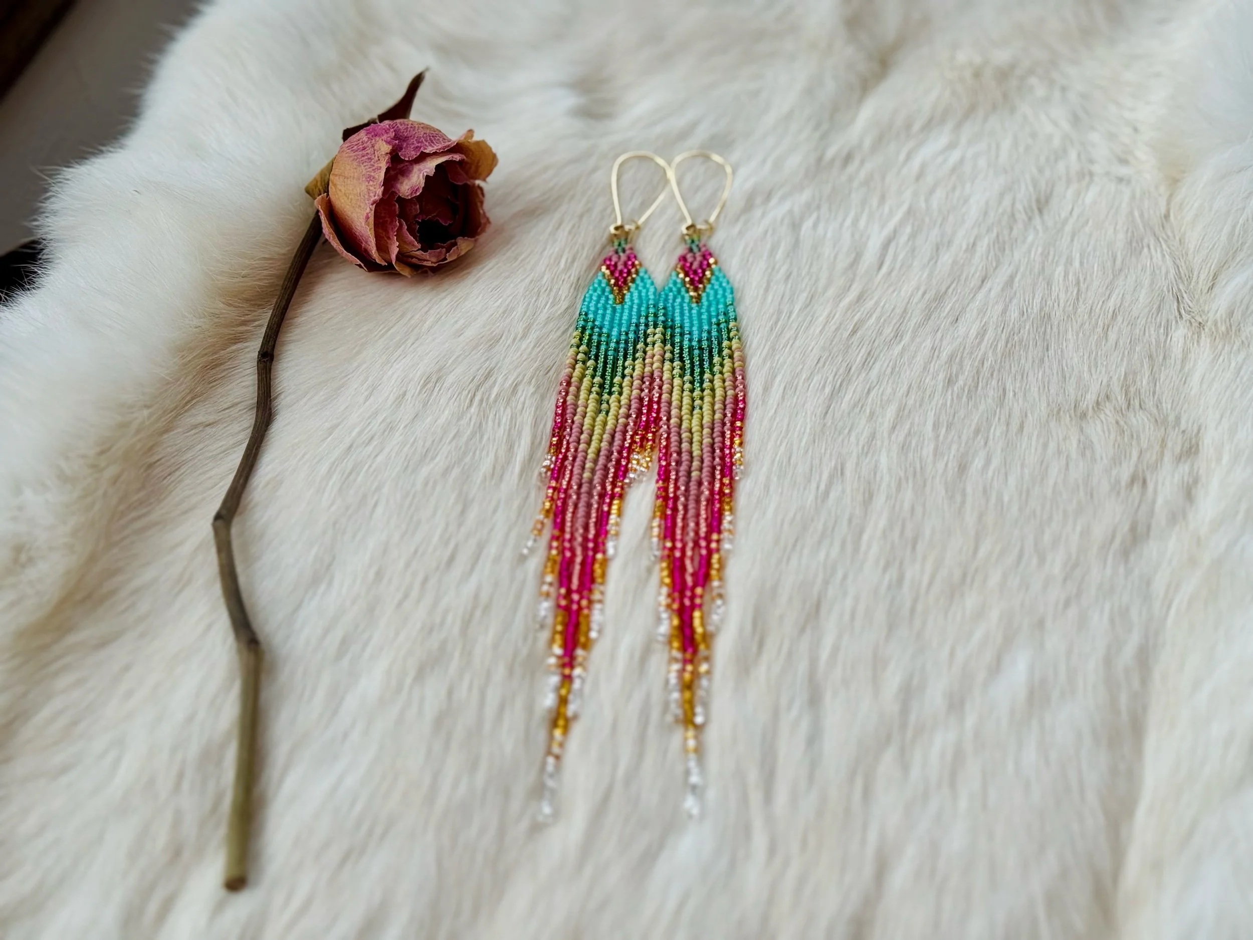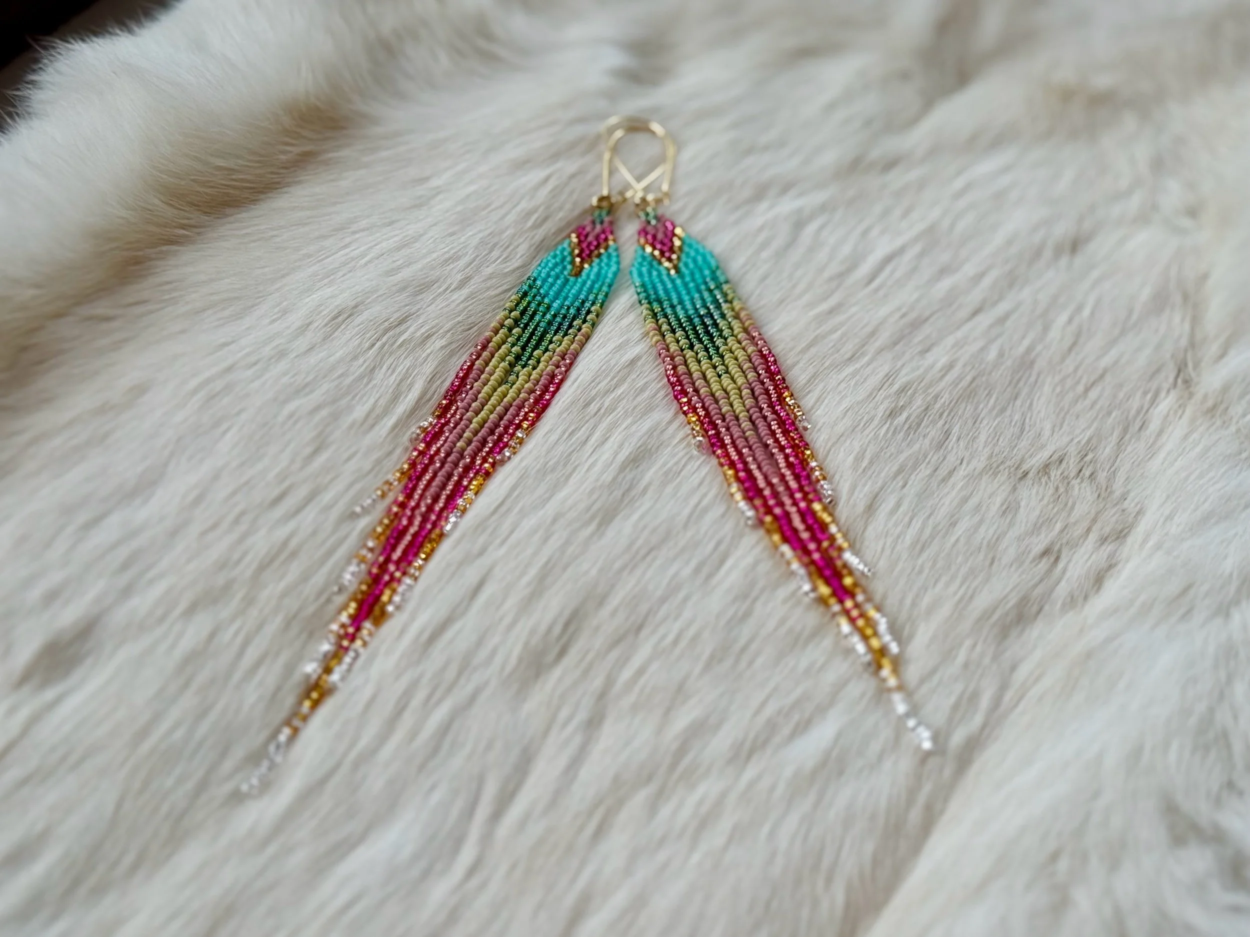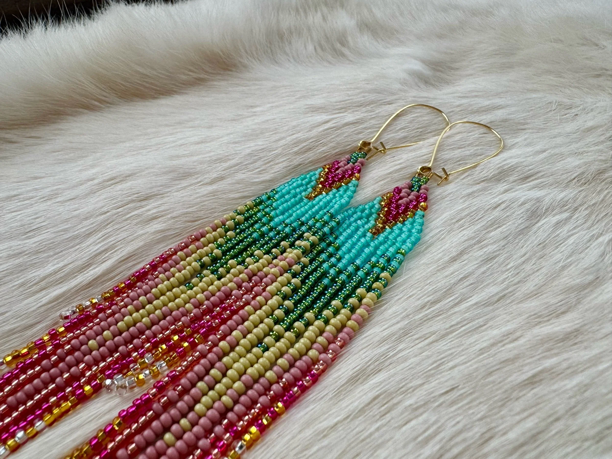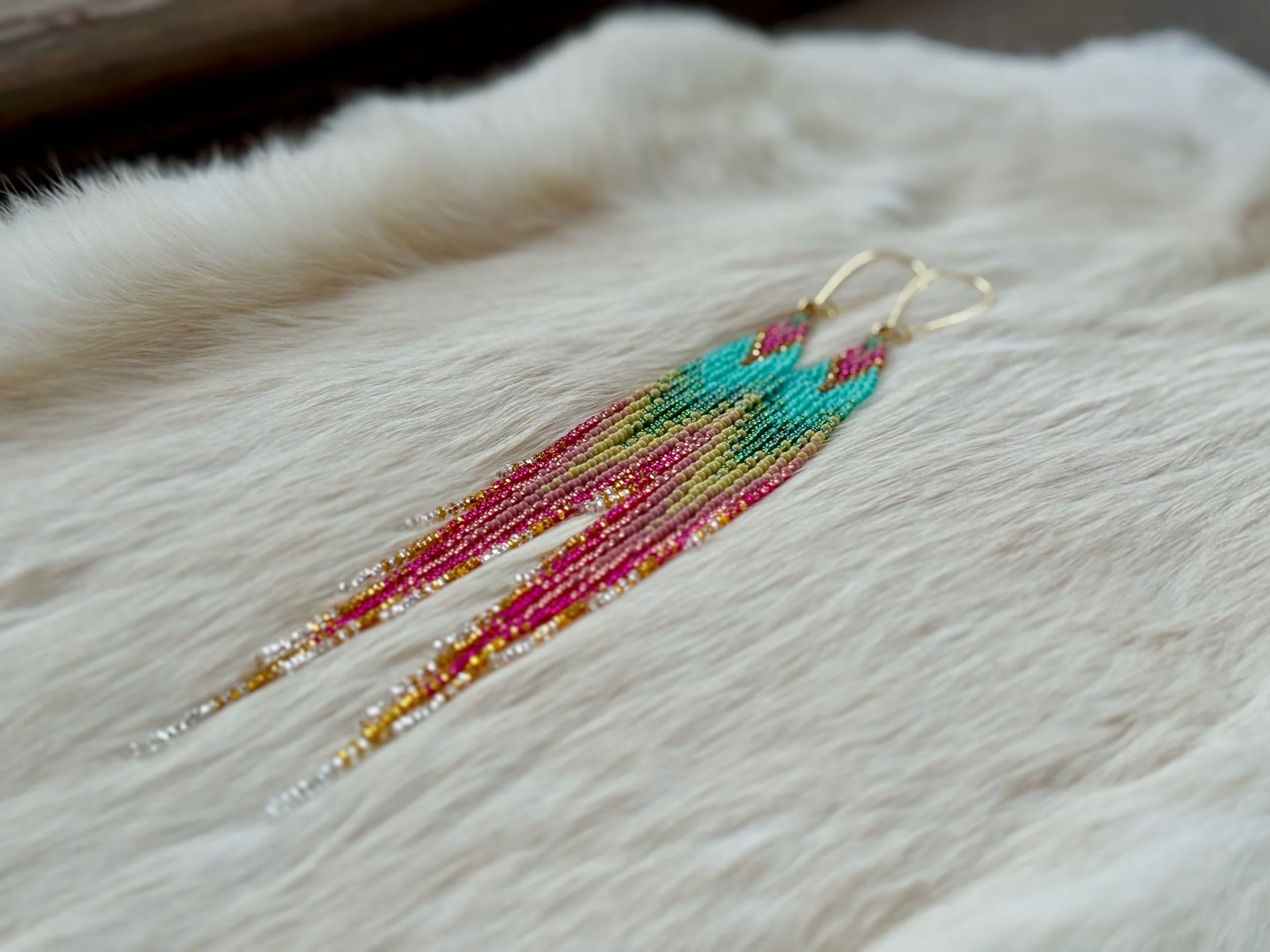 Made with glass seed beads and hypoallergenic 14k gold plated stainless steel hooks. 8.5 inches.
