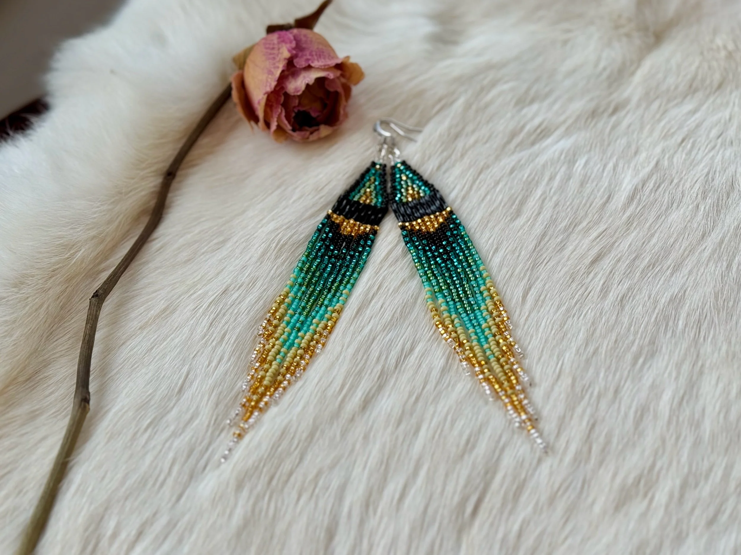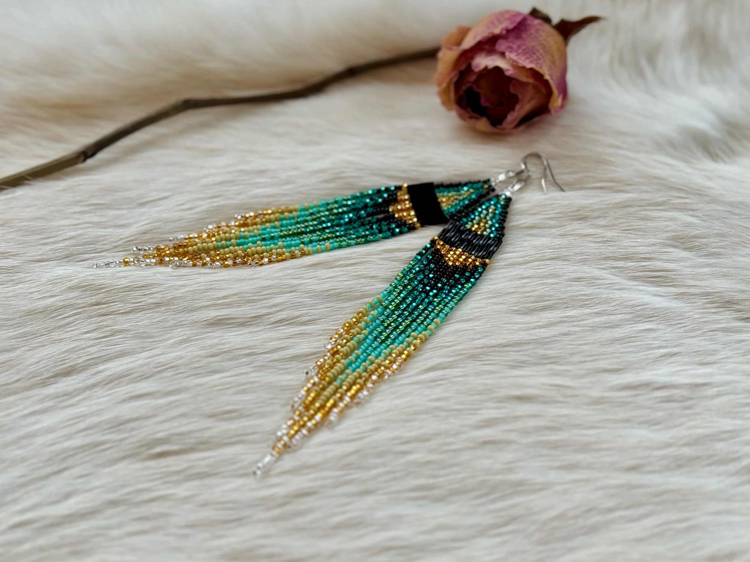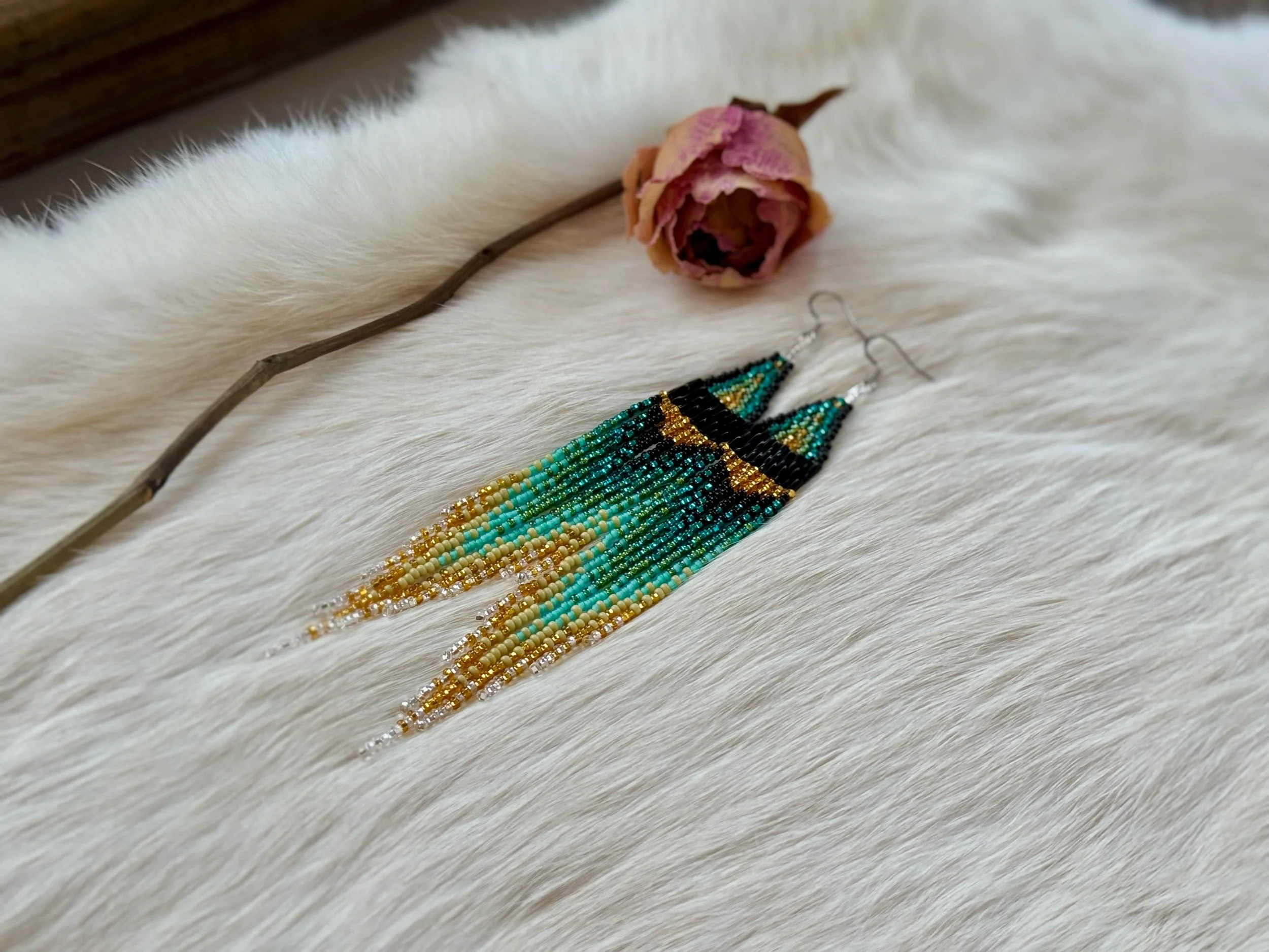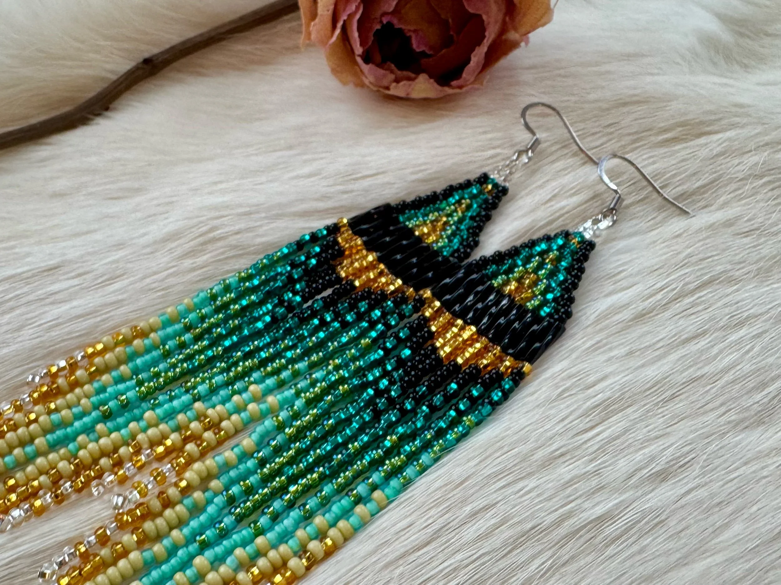 Made with glass seed beads and hypoallergenic stainless steel hooks. Earrings hang just under 6 inches.