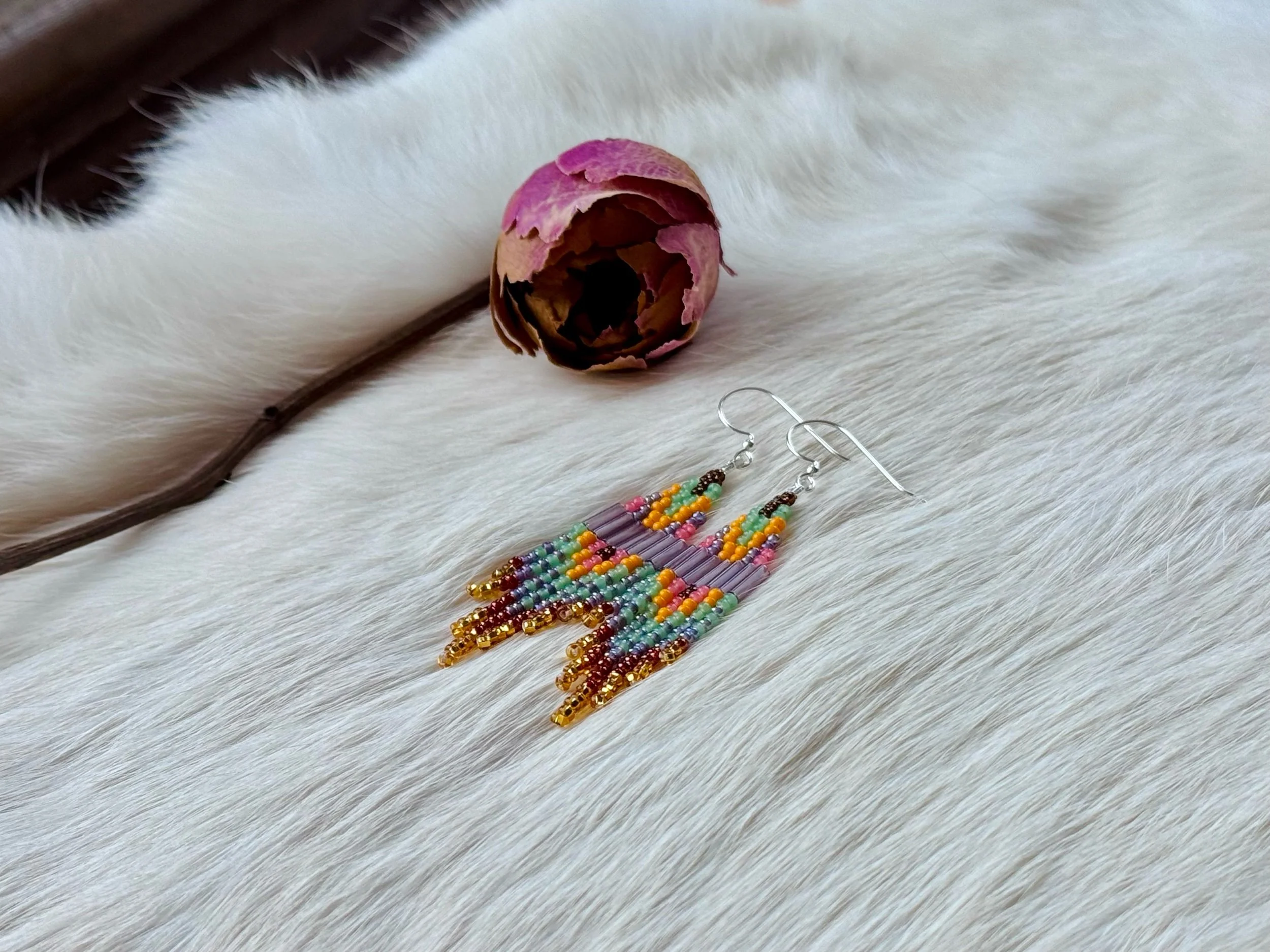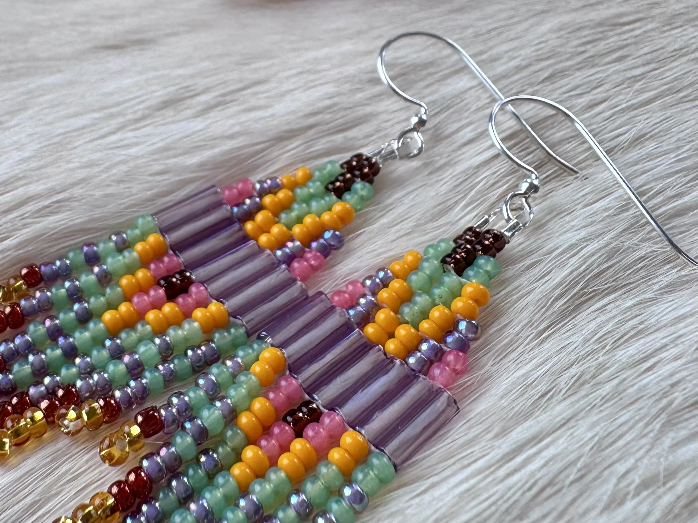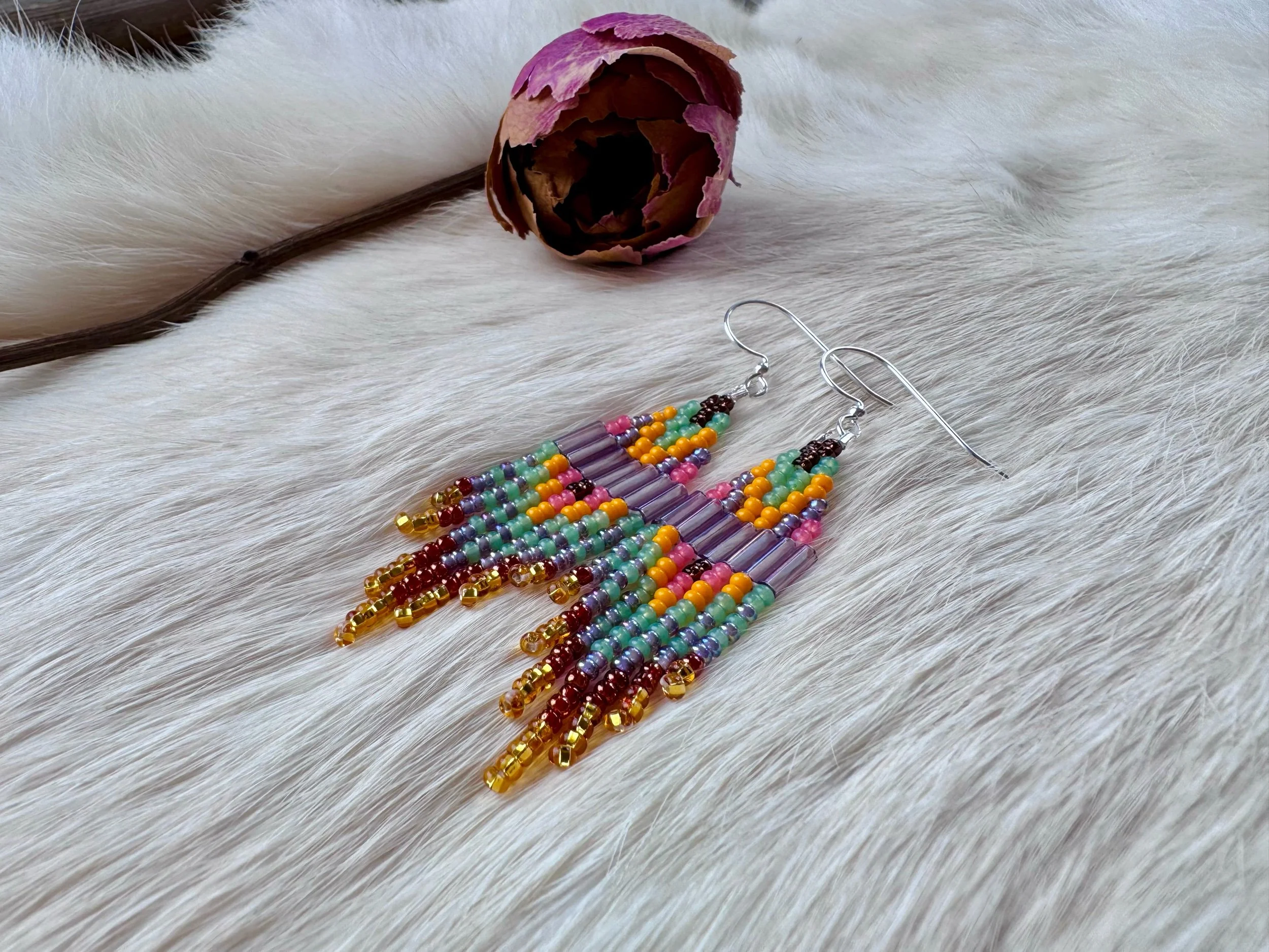 Made with a selection Czech and Japanese glass seed beads. Hooks are sterling silver plated.