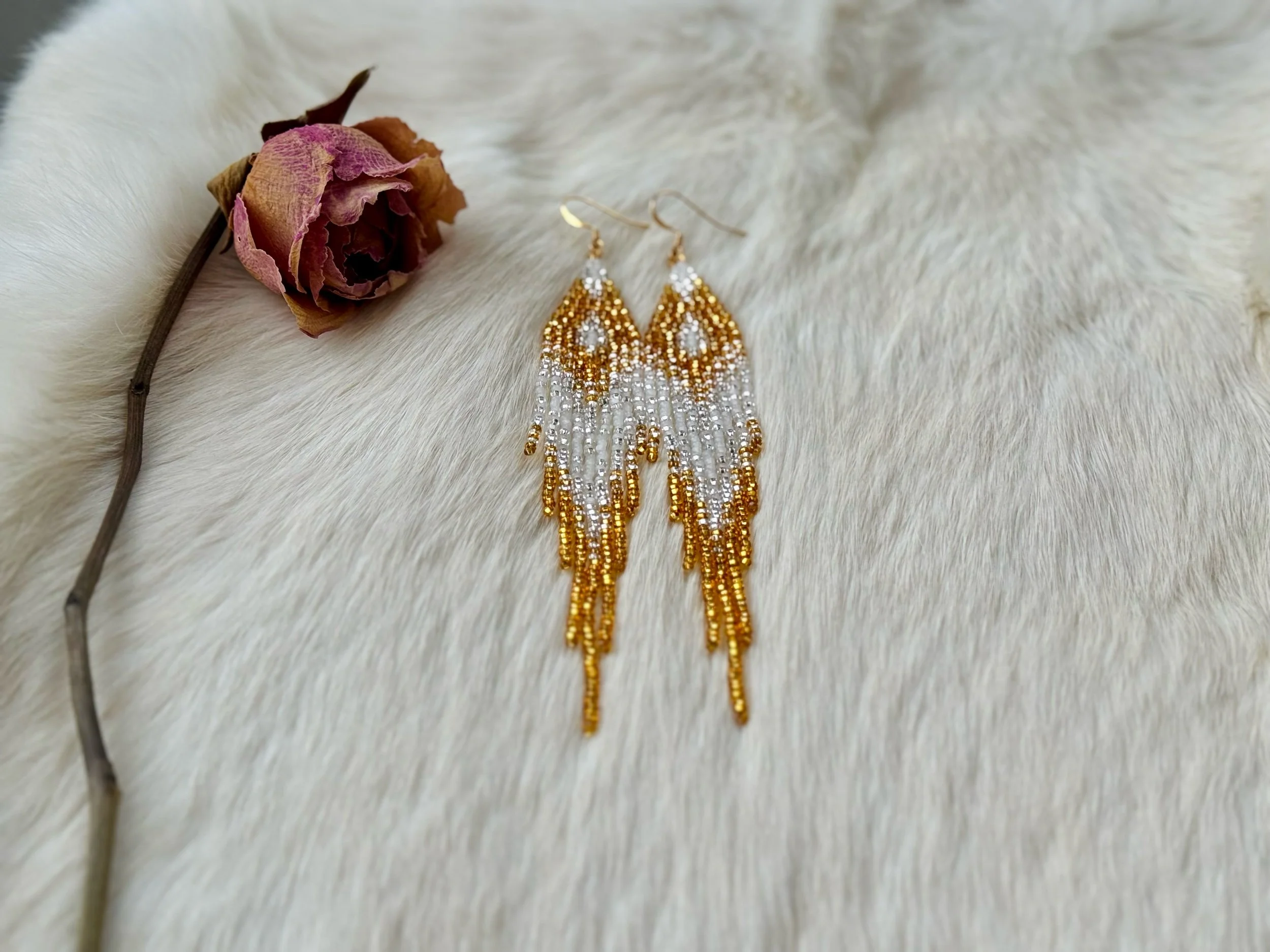 Made with glass seed beads and hypoallergenic gold plated stainless steel hooks. 5.5 inches.