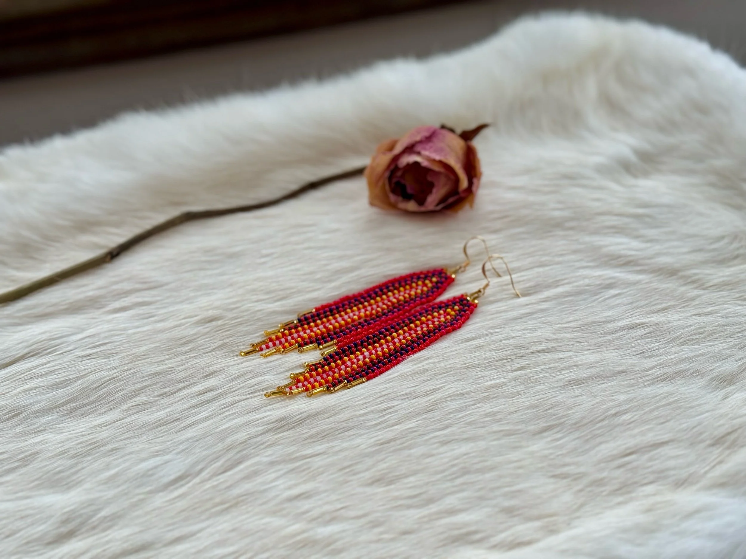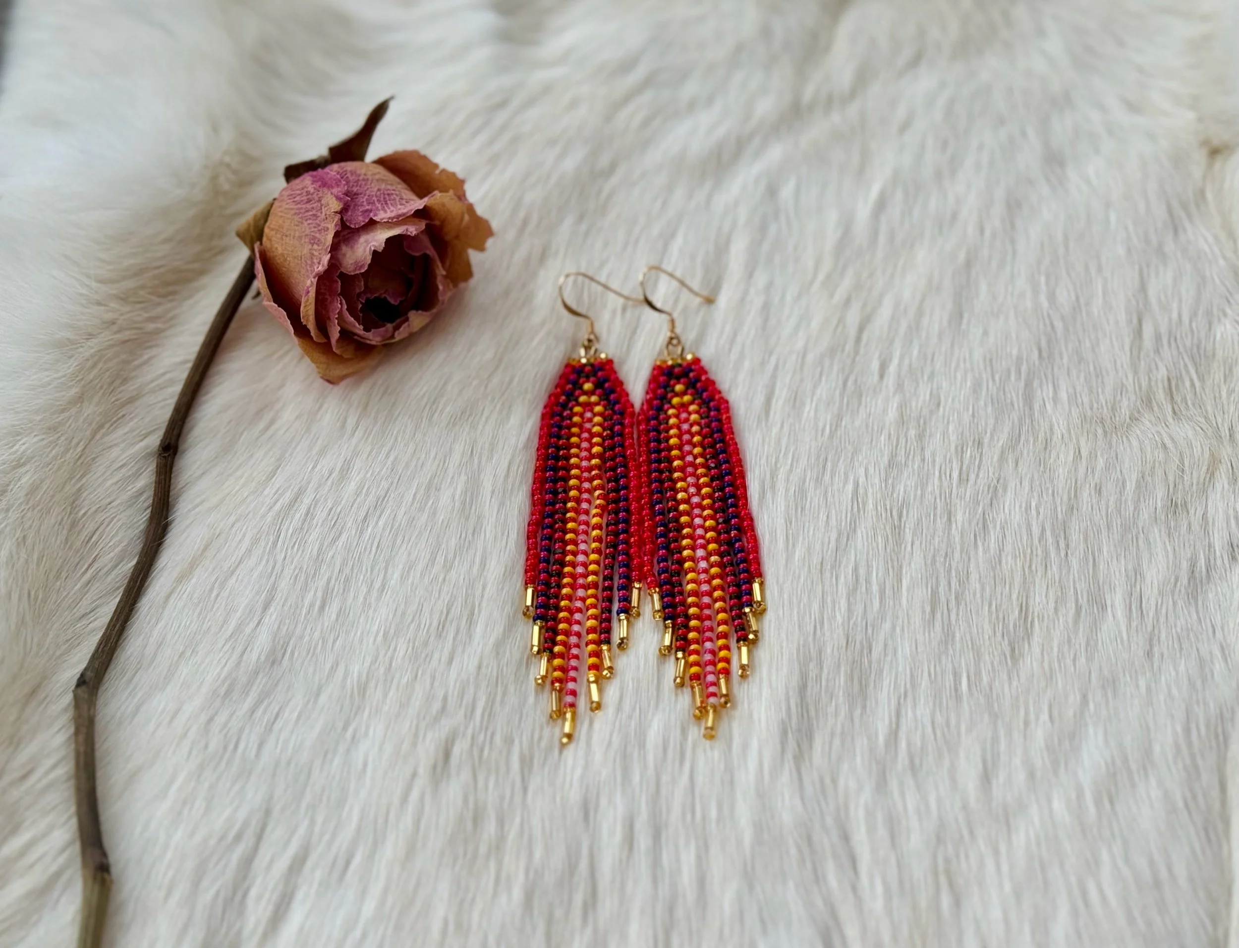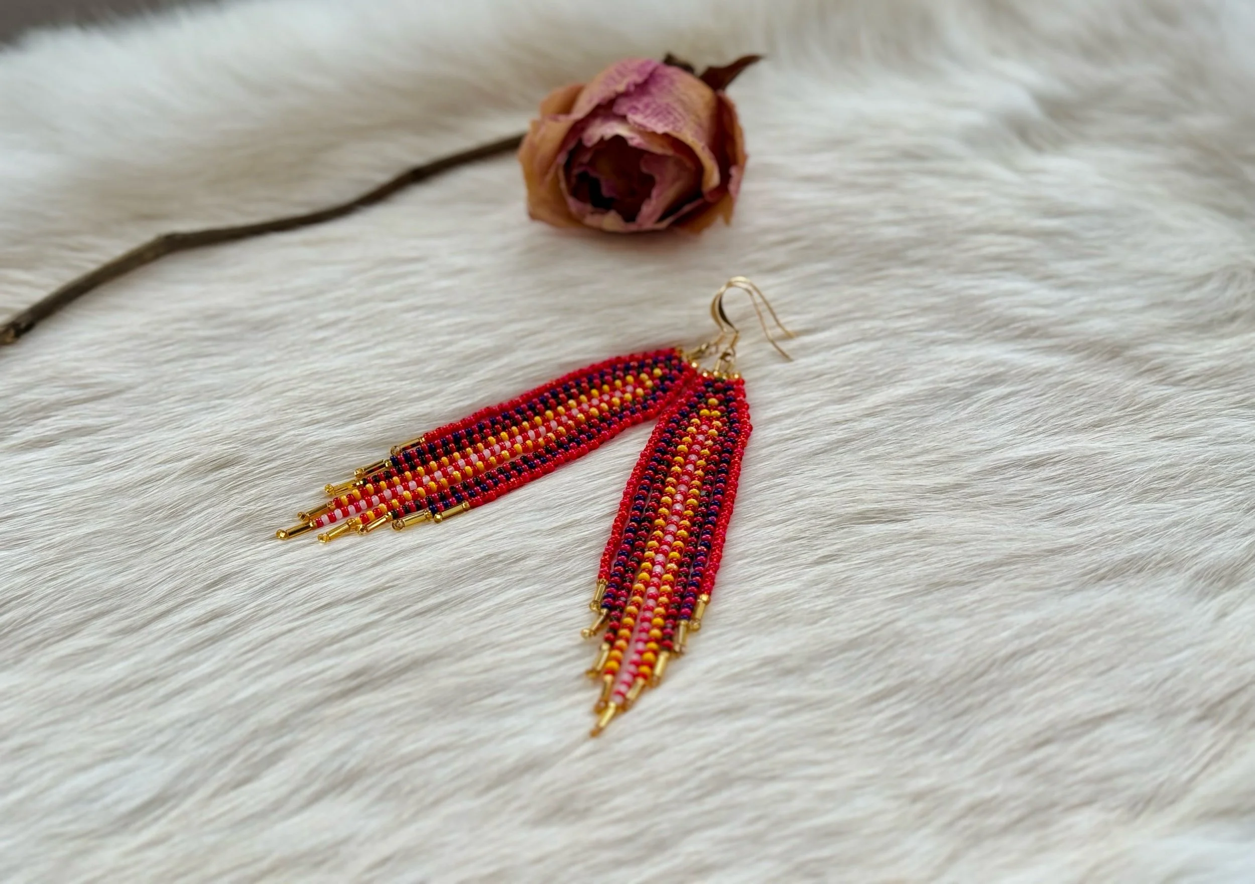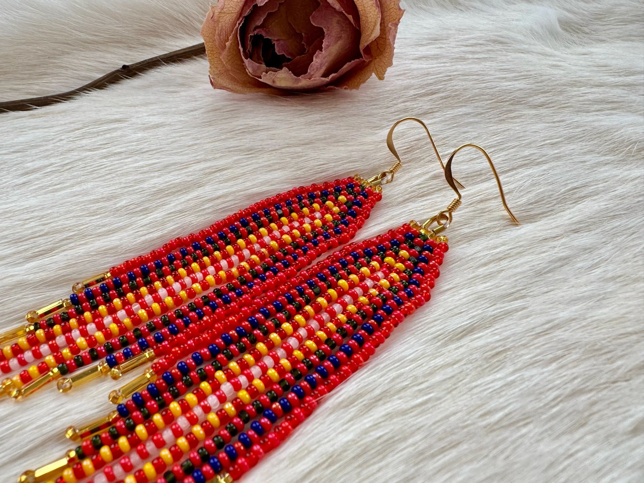 Metis sash earring is made with glass seed beads and hypoallergenic gold plated stainless steel hooks. 4.5 inches.